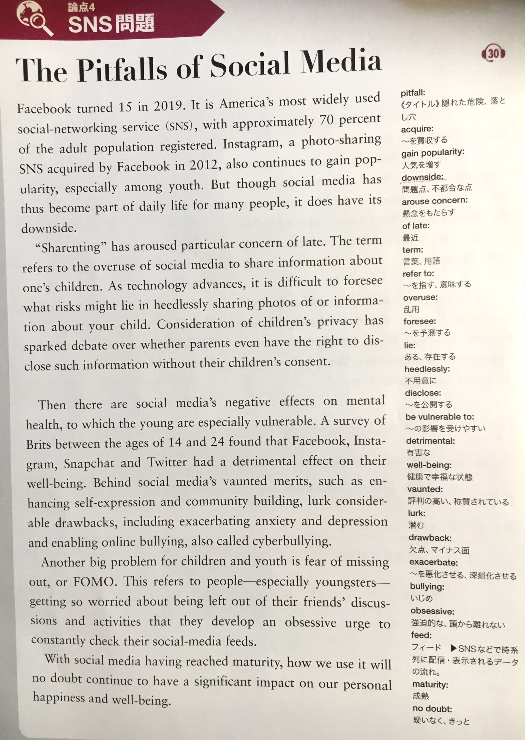 CNN English Express12月号の「世界の論点2019ー2020」から、”The Pitfalls of Social Media”を取り上げます。生の英語ニュースからSNSのメリット、デメリットを学び、議論しますので、皆さんの意見も聞けて、楽しみですね。
