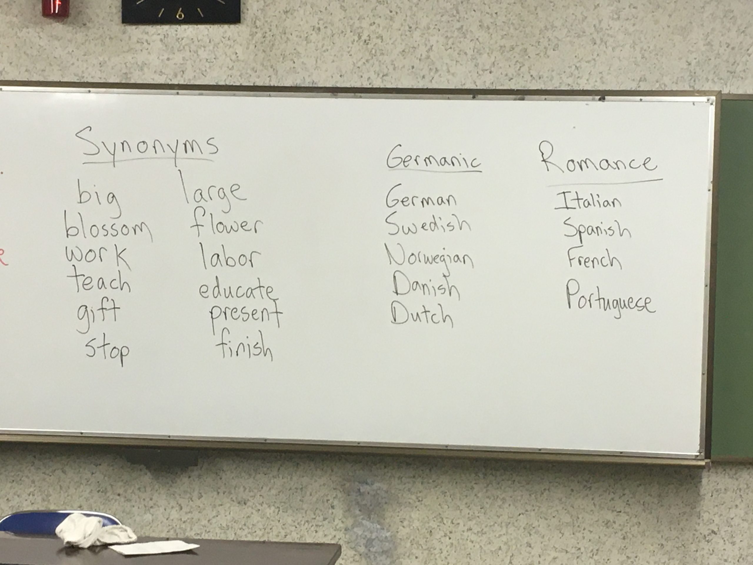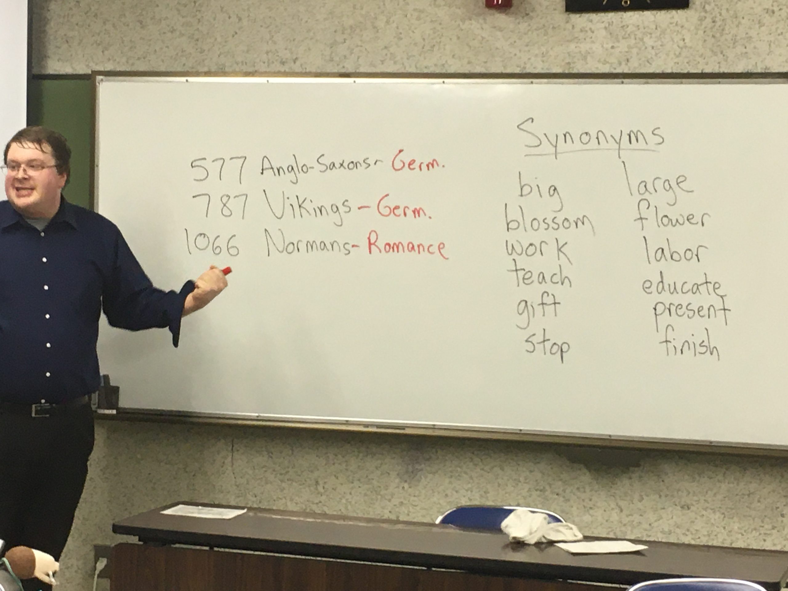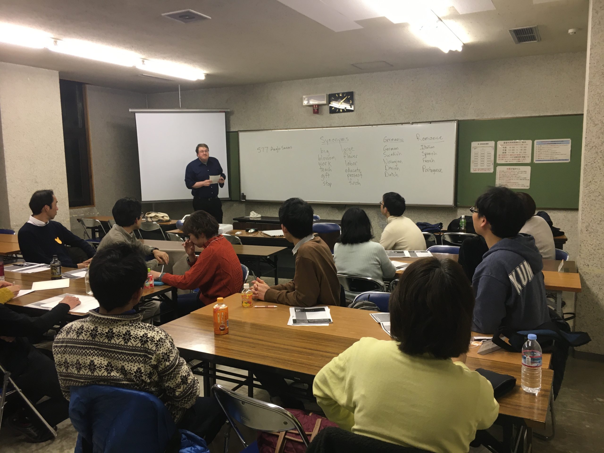 アドタイムでは、ALT英語講師のJ先生が、熱弁を奮ってくれて、Synonym(同義語)の説明から、英語の語源の説明をしてくれて、とても勉強になりました。 つまり、Germanic (German, Swedish, Norwegian, Danish, Dutch) + Romance(Italian, Spanish, French, Portuguese)=English という関係です。 557年にAnglo-Saxons (Germ.)がイギリスに来て、787年にVikings(Germ.)が来て、1066年に、Normans(Romance)が来て、二つの語源が、交わってきたので、二通りの単語がある。Big↔︎Largeのように! なるほどと思いました。素晴らしい。