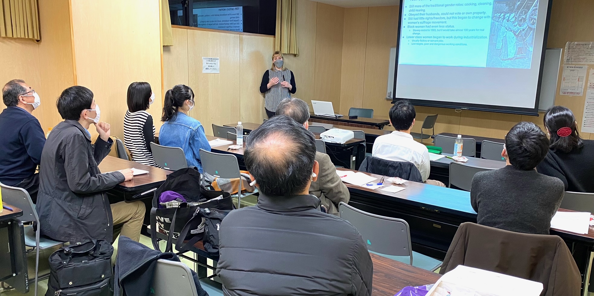 いつものように、素晴らしい内容で、参加者全員が、聞き入っていました。アメリカでは、人種差別だけではなく、女性に対する差別も酷く、アメリカの歴史の中で、女性自身が立ち上がって、差別を無くす運動を続け、憲法、法律化へとしてきた。 それでも、まだ、差別は根強く残っていて、社会、男性の理解と協力が不足しているということでした。 日本は、更に、アメリカより遅れていることになりますね。