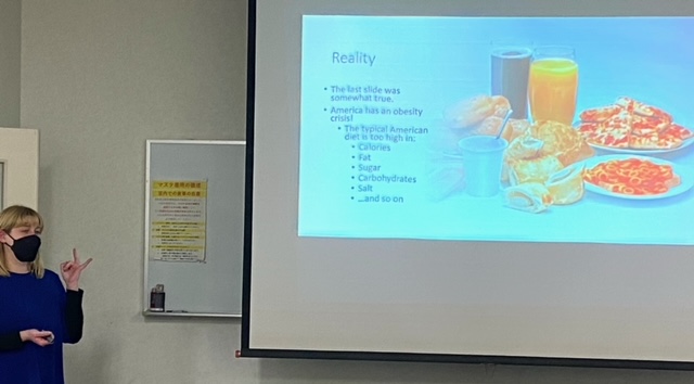 2. アドタイム(19:00-19:50) テーマ:”The American Diet” 英会話講師のシャイアンさんのプレゼン